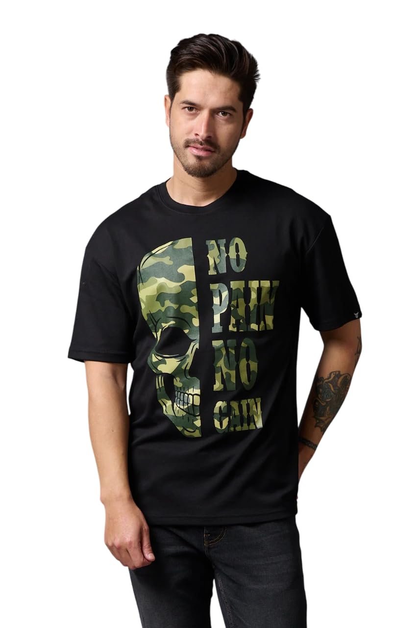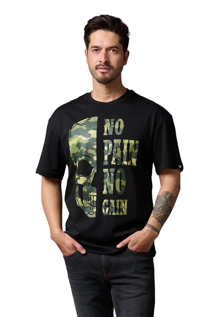 Go Devil Men’s Oversized T-Shirt No Pain No Gain in Camo Graphic Printted Black Cotton Top Short Sleeve Graphic Tees
